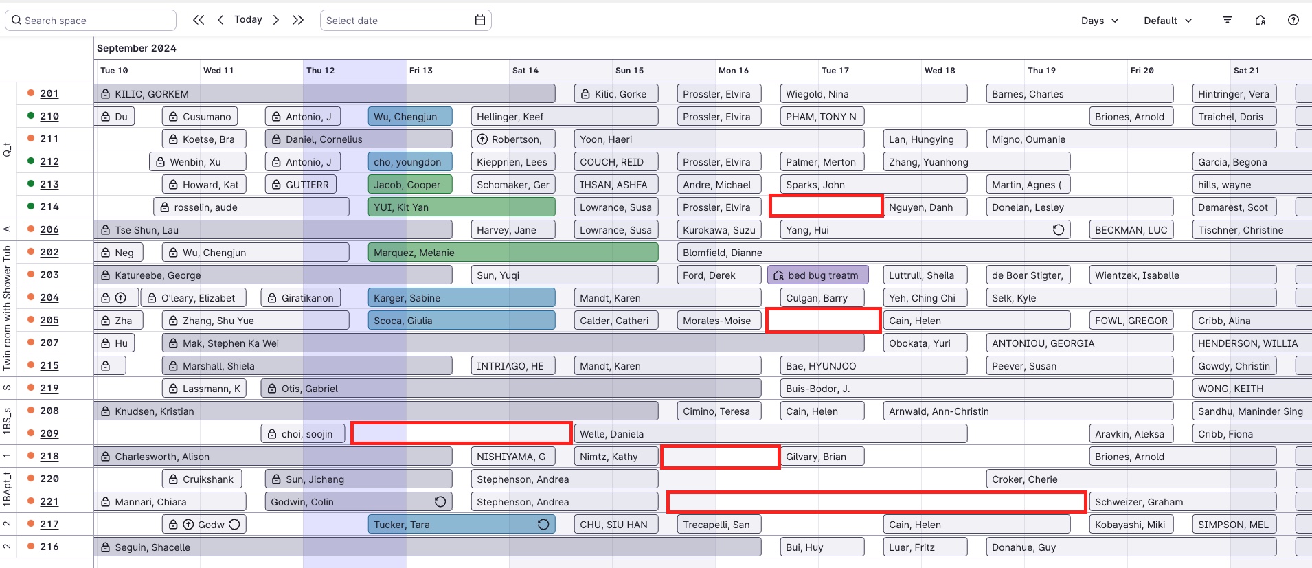 - Check if we have any clean rooms available (available rooms appear as blank spaces in the timeline and inspected rooms have a green dot next to the room number in the timeline).